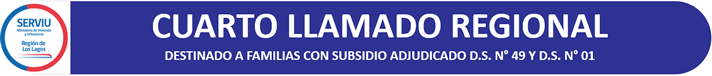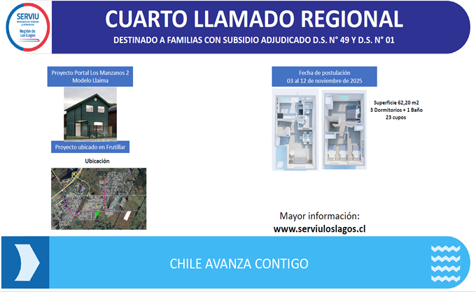 Cuarto Llamado Regional 2025 a inscripción para asignación de cupos de viviendas destinadas a familias beneficiarias del Subsidio D.S. N° 49 o D.S. N° 01, tramo 1, del Programa de Integración Social y Territorial D.S. N° 19, del proyecto denominado Portal Los Manzanos 2, de la comuna de Frutillar. Este llamado está destinado a familias que han sido seleccionadas con un subsidio habitacional del D.S. N° 49 o D.S. N° 01, tramo 1 que se encuentre vigente y sin aplicar, para la asignación de cupos de viviendas al Proyecto D.S. N° 19, denominado Portal Los Manzanos 2, de la comuna de Frutillar.
